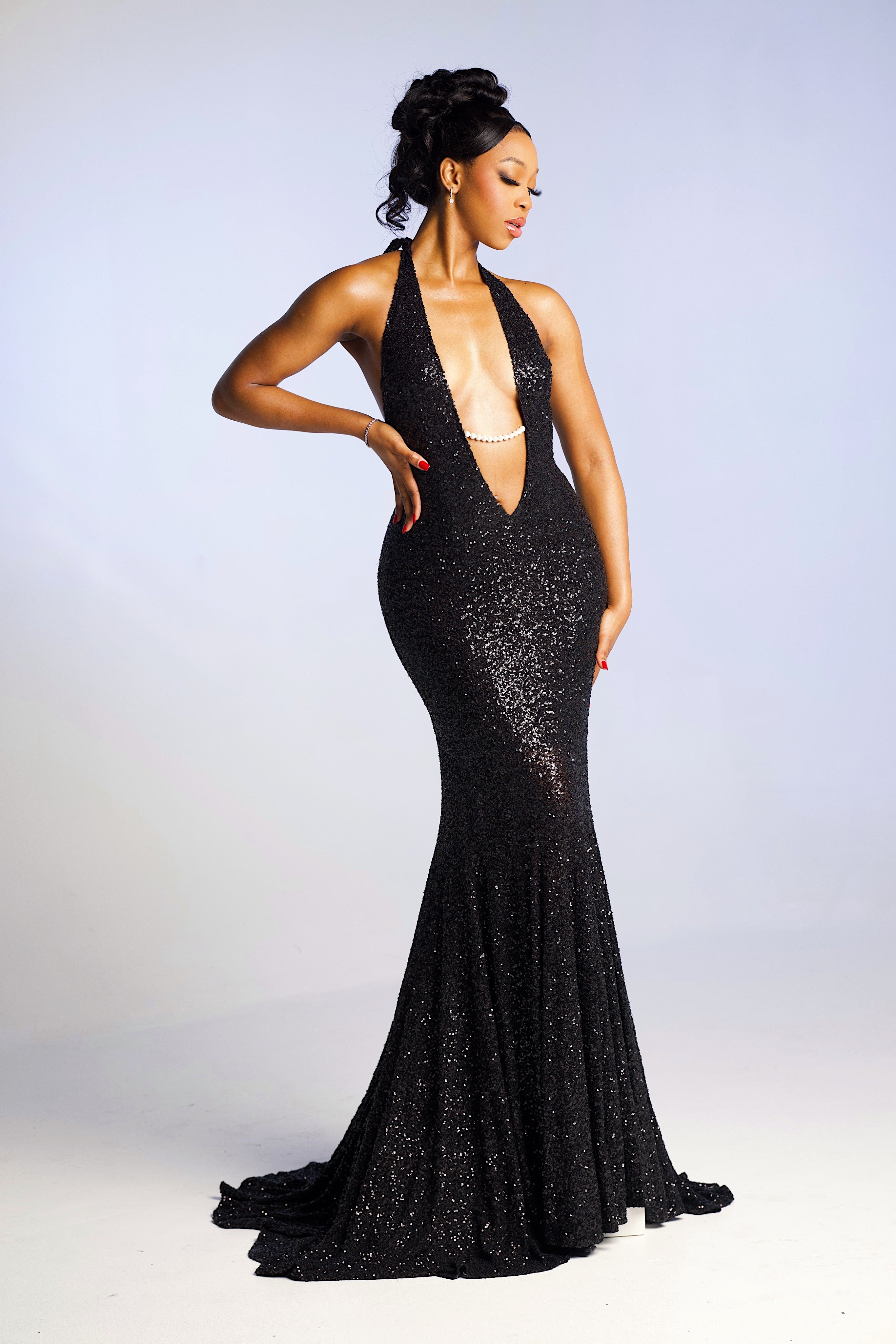Crafted from a subtly see-through sequin fabric material, the Jocelyn Dress envelops you in a shimmering allure that is both alluring and elegant. The daring long V-neck cut in the front adds a touch of sultry charm, perfectly balancing the dress's classy silhouette with an undeniable allure.